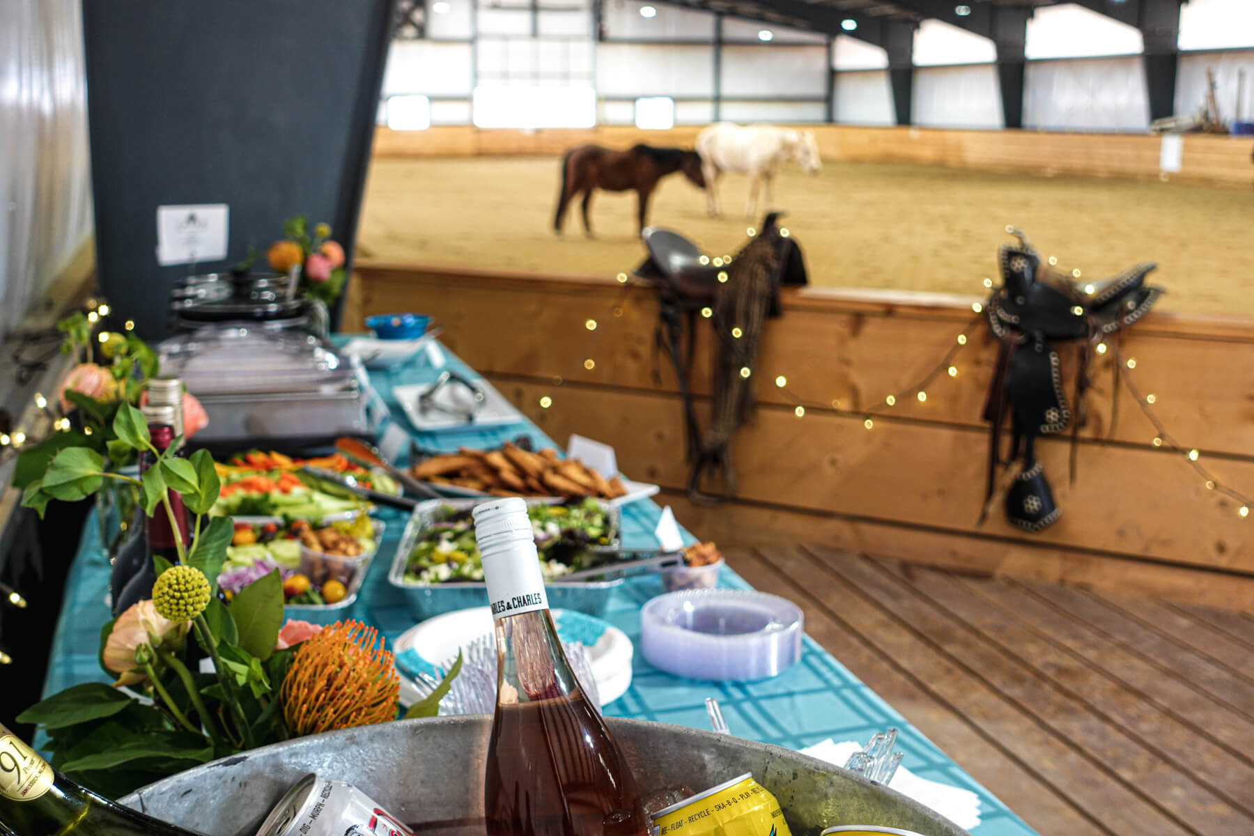 Scrumptious, catered dinner and drinks served ring side with the horses after your equine experience!